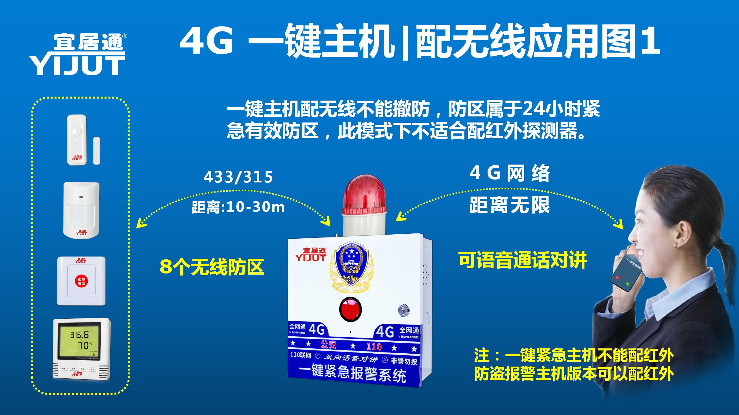 宜居通四鍵4G緊急對(duì)講報(bào)警主機(jī)是集多項(xiàng)先進(jìn)技術(shù)、功能于一體的卓越的智能安全技術(shù)防范產(chǎn)品。緊急報(bào)警系統(tǒng)由報(bào)警主機(jī)、遙控器、報(bào)警喇叭、等組成。觸發(fā)相應(yīng)按鈕,即可觸發(fā)報(bào)警喇叭長(zhǎng)鳴,可通過(guò)遙控關(guān)閉喇叭,安裝方便、操作簡(jiǎn)捷廣泛應(yīng)用于各種金融營(yíng)業(yè)場(chǎng)所、各種倉(cāng)庫(kù)、商業(yè)店鋪、寫字樓辦公室、企事業(yè)單位、家庭等安防系統(tǒng)中。可定制多種功能,如GSM功能,無(wú)線聯(lián)網(wǎng)功能等,主機(jī)面板自帶4個(gè)一鍵緊急報(bào)警按鈕,每個(gè)緊急求助報(bào)警按鈕的警情可自定義修改,比如可改成為:暴力,火災(zāi),地震,空襲等功能。