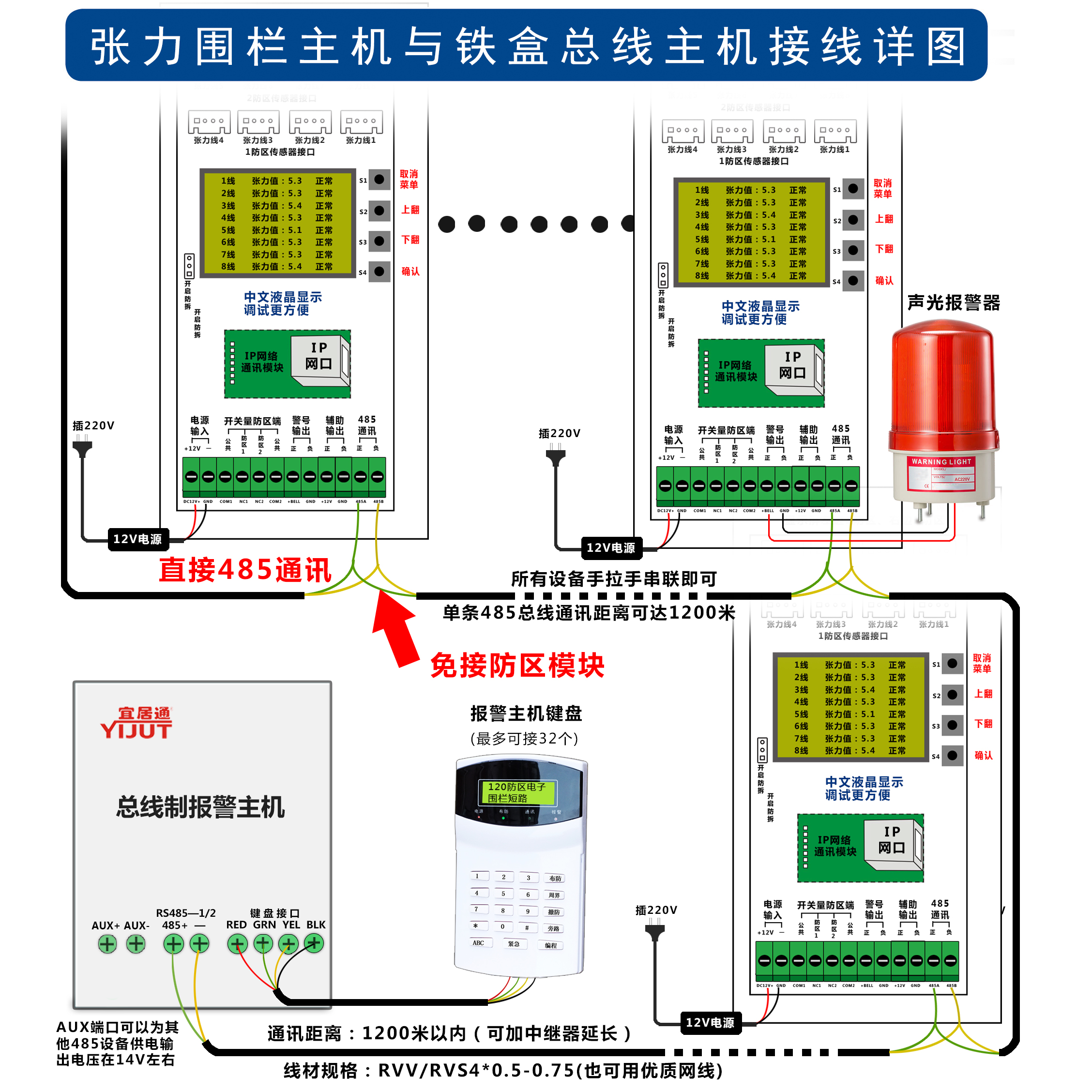 l 如果張力電子圍欄控制器的總控主機配置的是宜居通總線主機則可直接在總線主機上面進行外接擴展宜居通張力電子圍欄控制器即可,不需要配置防區(qū)地址模塊,總控主機可直接反向?qū)θ我庖慌_張力電子圍欄控制器進行布防/撤防控制