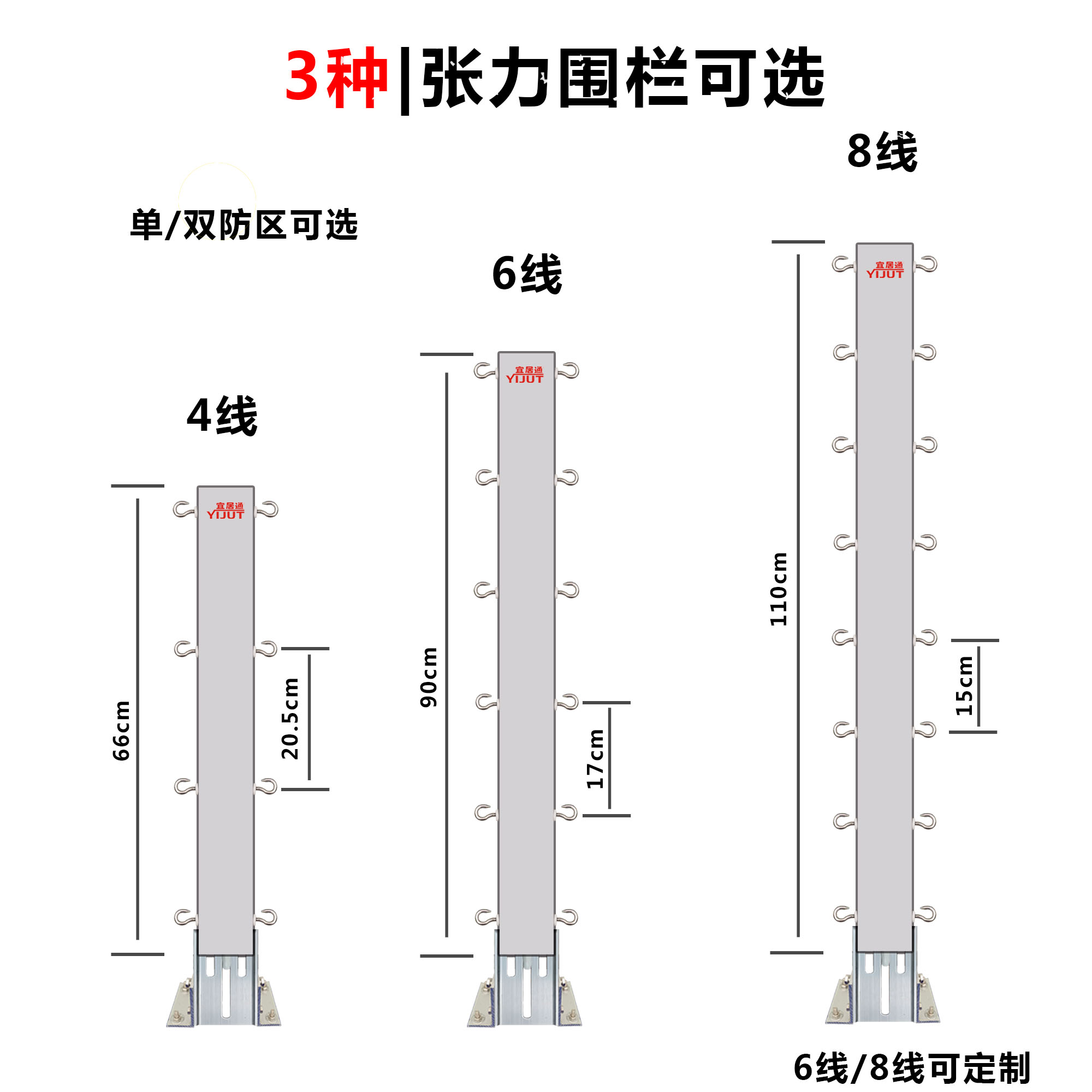 從安裝線制來分,張力電子圍欄分為4線、6線、8線3種,其中常用的是4線居多,6線和8線是要求比較高的特殊場合才會用到,我司可提供6線和8線2種非常規(guī)類型的定制。