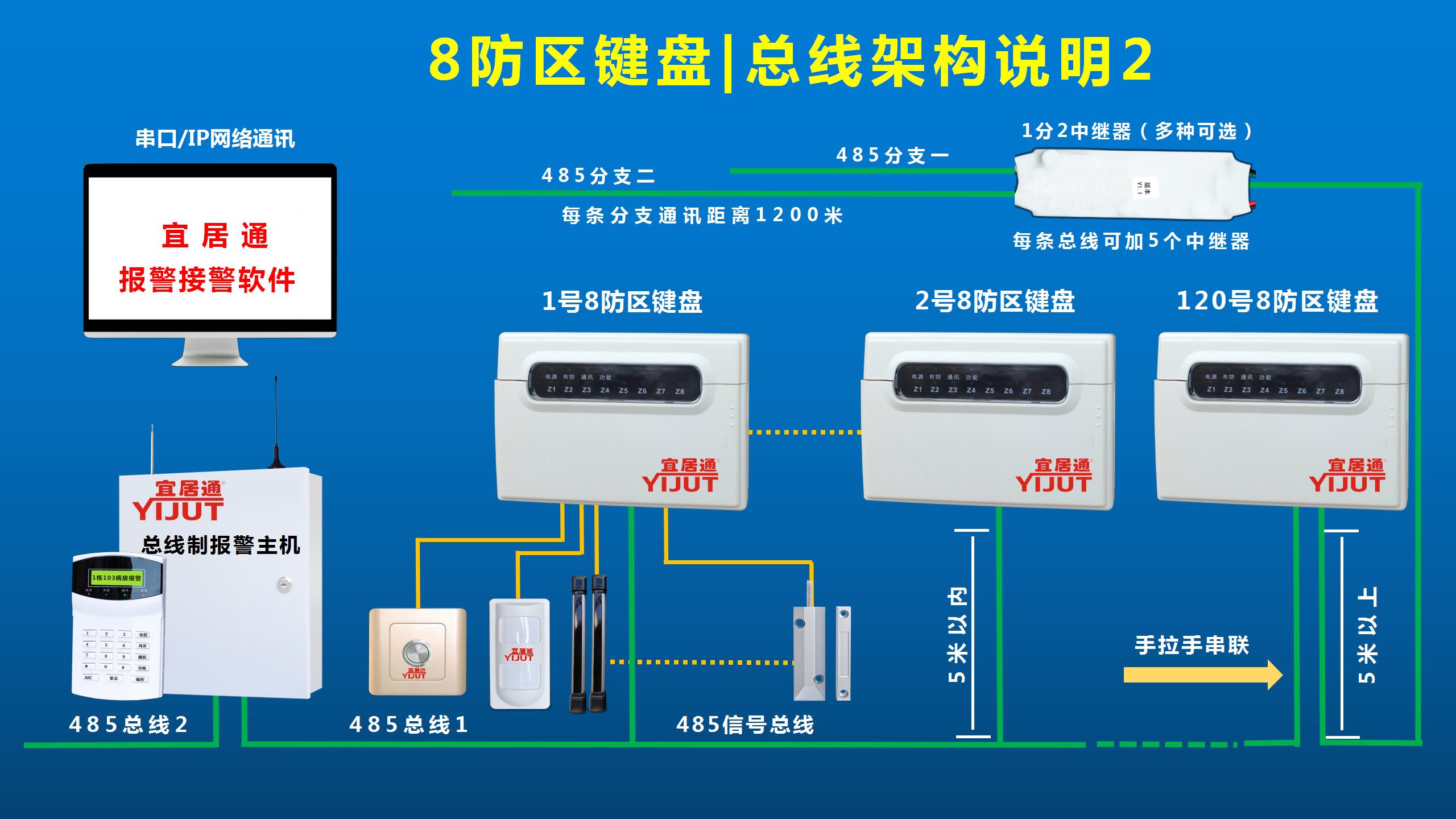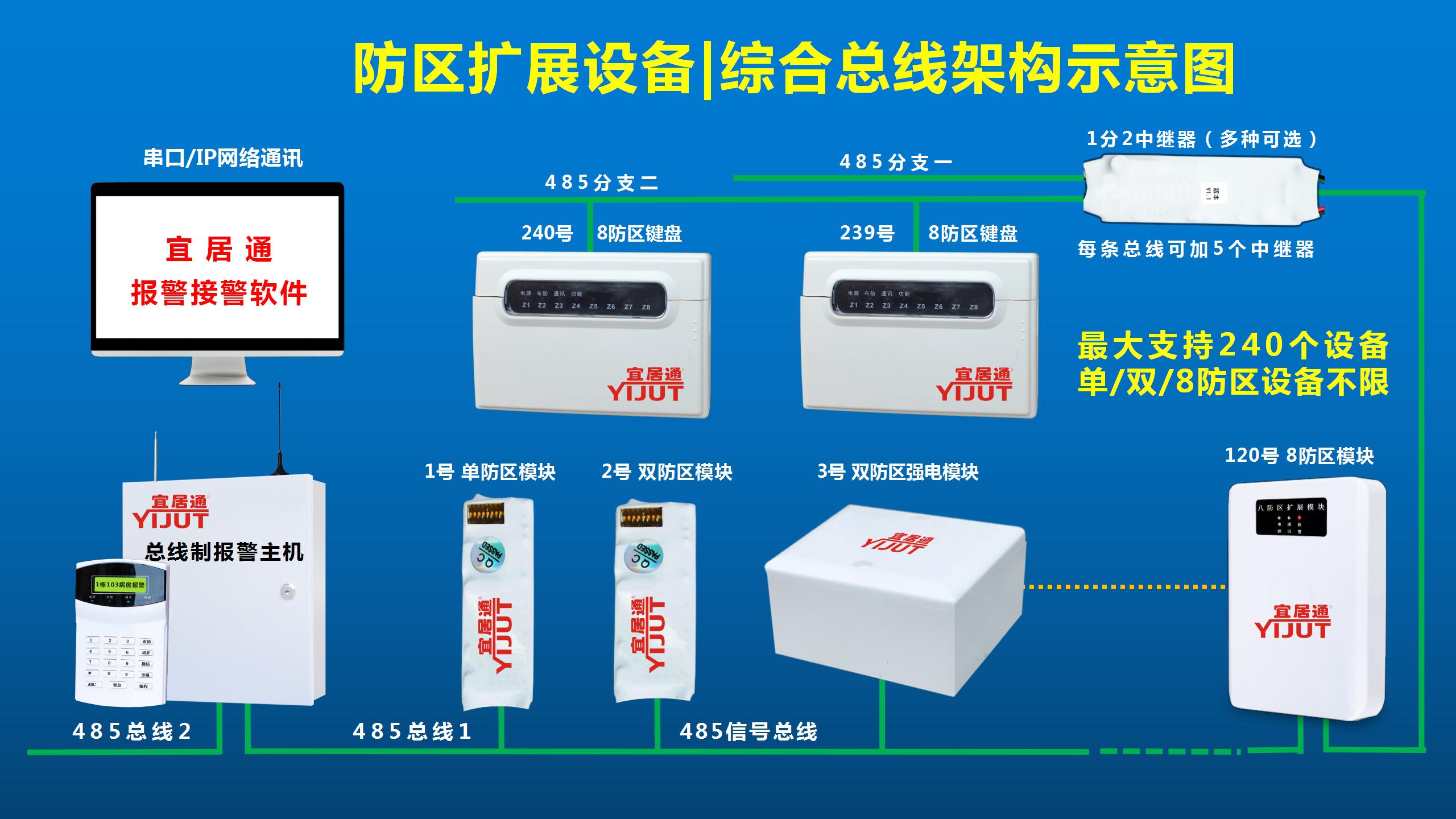 ?無(wú)線防區(qū)有線防區(qū)兼容設(shè)計(jì):該小型8防區(qū)用戶小主機(jī)具有485總線通訊功能,可與宜居通任意一款總線制報(bào)警主機(jī)進(jìn)行485有線聯(lián)網(wǎng)使用。