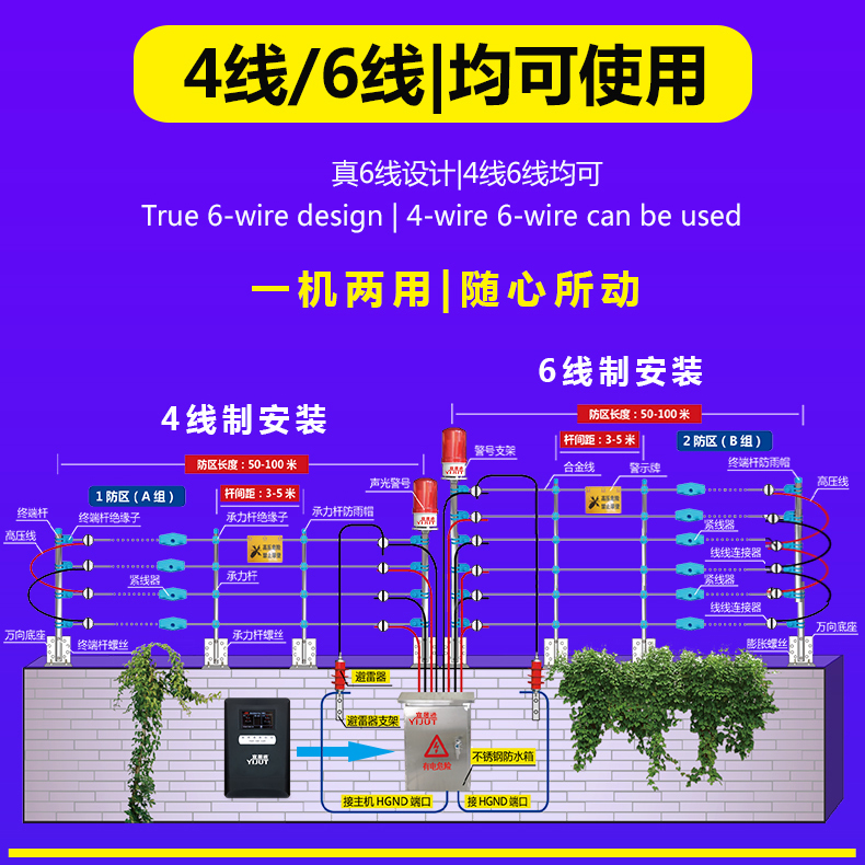 l 支持多種接線方式:該電子圍欄主機采用真正的雙防區(qū)6線制設(shè)計,支持4線、6線、8線等多種接線方式,用戶可根據(jù)需要選擇合適的接線方式即可,靈活方便。