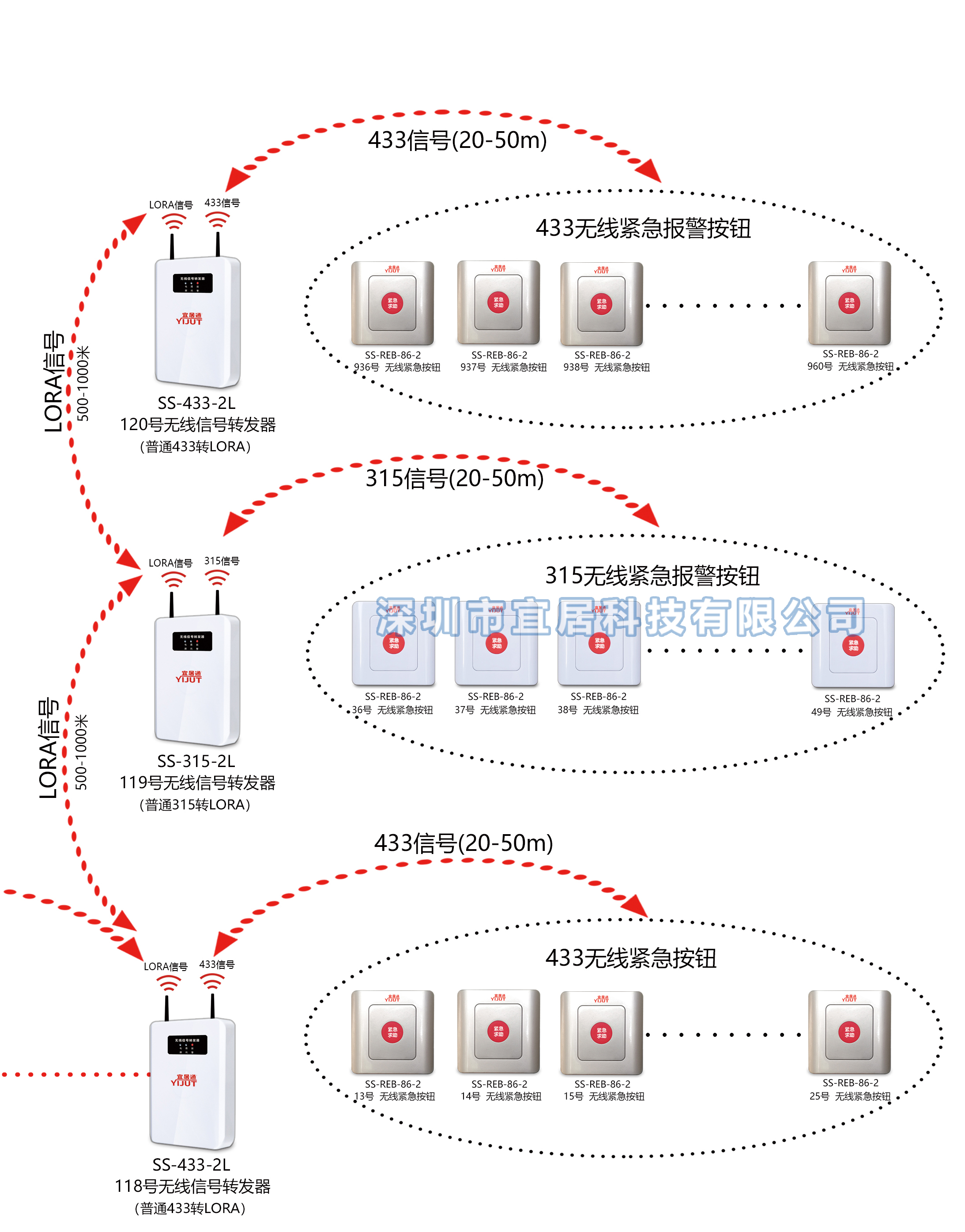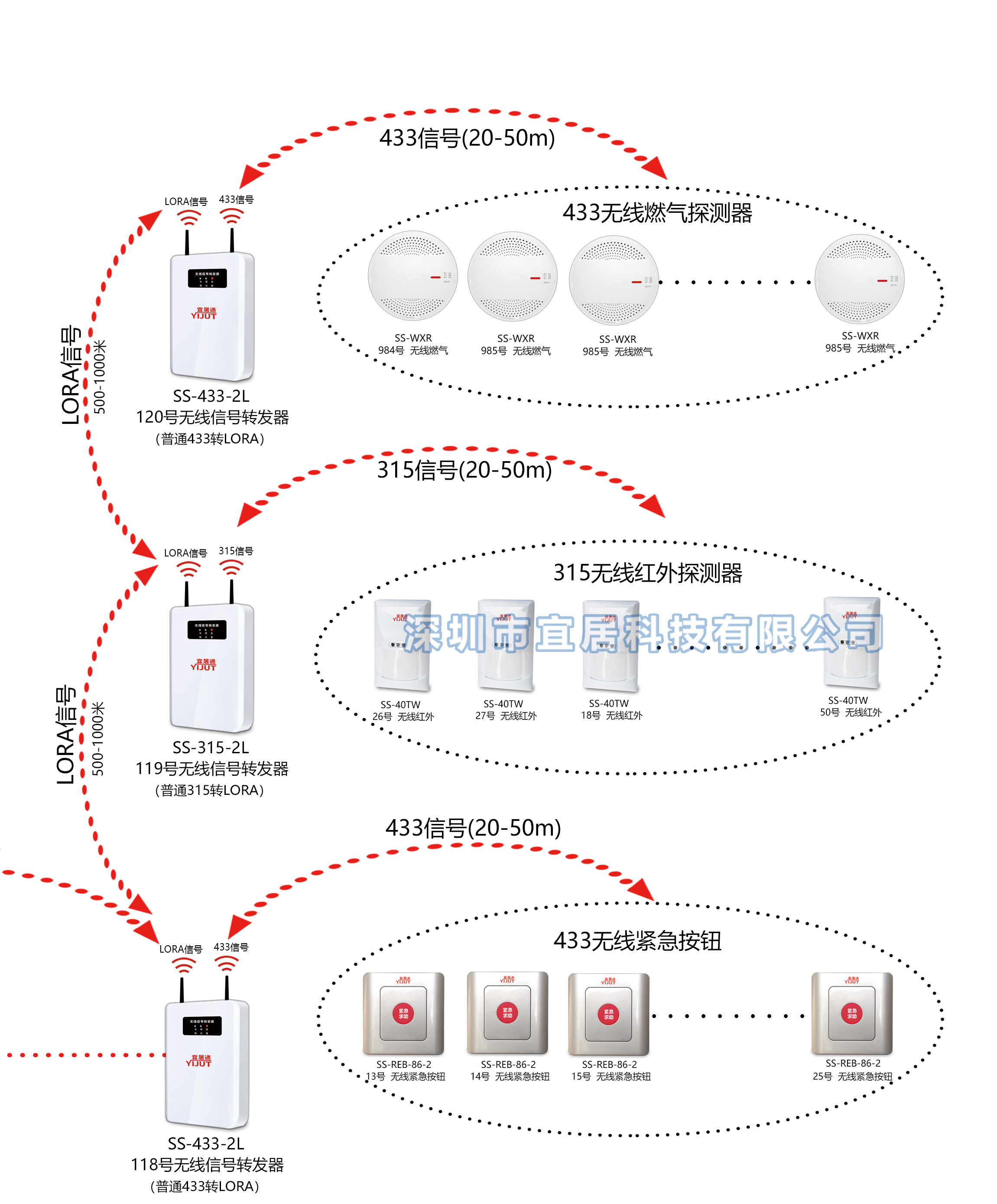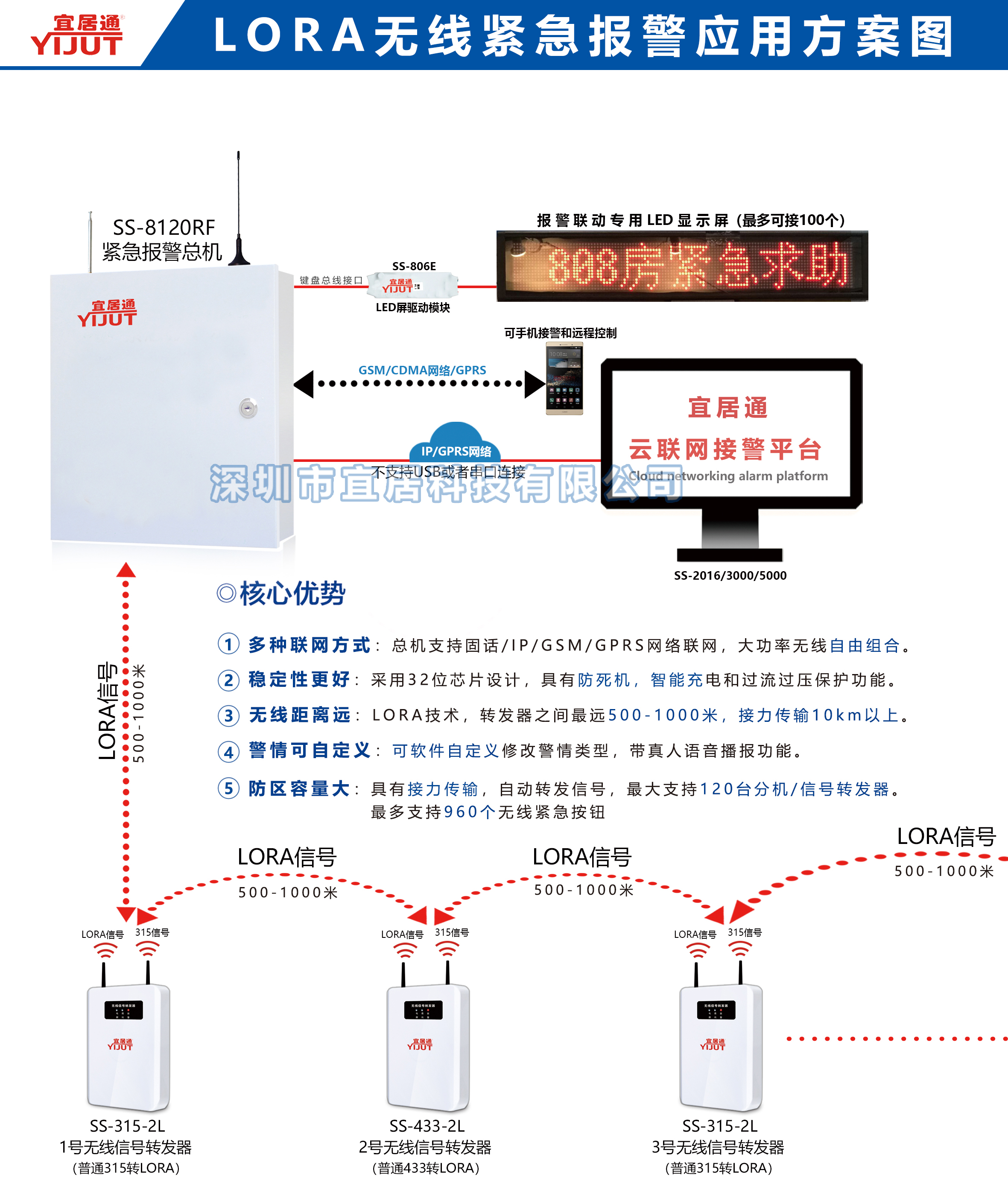 深圳市宜居科技有限公司是國內(nèi)最早從事LORA無線聯(lián)網(wǎng)報(bào)警系統(tǒng)研發(fā)和生產(chǎn)的廠家之一,專注于各種LORA無線聯(lián)網(wǎng)報(bào)警系統(tǒng)的研發(fā)生產(chǎn),公司2008年成立至今,已經(jīng)成功研發(fā)出多種LORA無線聯(lián)網(wǎng)報(bào)警系統(tǒng),通過LORA轉(zhuǎn)發(fā)器,可實(shí)現(xiàn)普通有線開關(guān)量探測器升級為LORA無線信號,并支持多個LORA轉(zhuǎn)發(fā)器自由組網(wǎng)聯(lián)網(wǎng)功能,比如可以將市面上普通的無線緊急按鈕,無線紅外對射,無線紅外光柵、無線燃?xì)馓綔y器、無線煙霧探測器等設(shè)備進(jìn)行跨區(qū)域大規(guī)模無線組網(wǎng)聯(lián)網(wǎng)使用。我們根據(jù)用戶的項(xiàng)目需求來設(shè)計(jì)不同類型的LORA無線聯(lián)網(wǎng)報(bào)警應(yīng)用方案,比如有LORA無線紅外入侵報(bào)警系統(tǒng),LORA無線緊急求助報(bào)警系統(tǒng),LORA無線周界報(bào)警系統(tǒng)、小區(qū)LORA無線燃?xì)庑孤﹫?bào)警系統(tǒng)、以及用于工廠的LORA無線煙霧探測報(bào)警系統(tǒng)等,以滿足不同應(yīng)用需求的無線聯(lián)網(wǎng)綜合報(bào)警系統(tǒng)。用戶可通過各種LORA無線報(bào)警系統(tǒng)應(yīng)用方案圖,快速了解宜居通LORA無線聯(lián)網(wǎng)報(bào)警系統(tǒng)在各種場合中的應(yīng)用,讓安防報(bào)警系統(tǒng)變得簡單易懂。