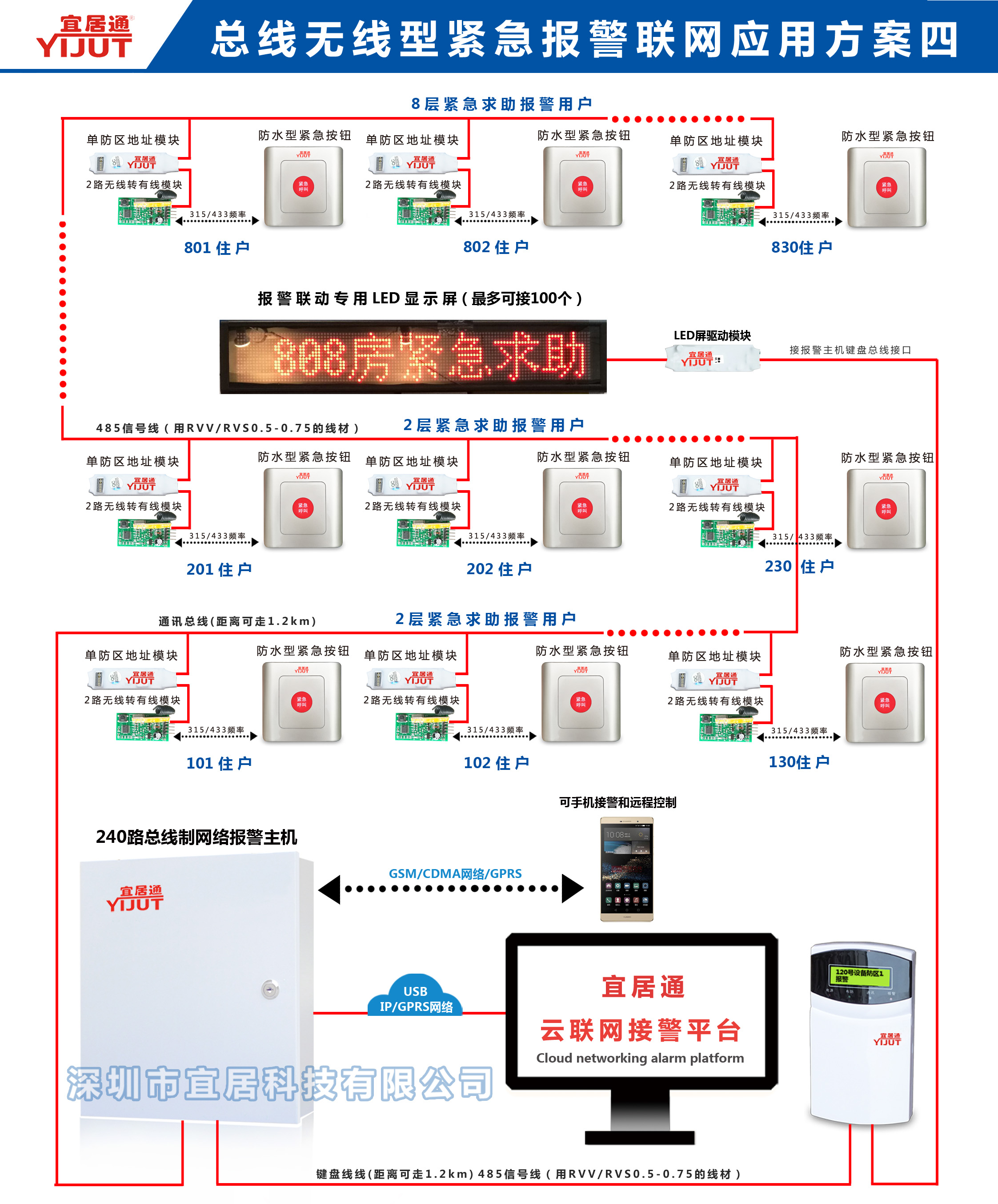 深圳市宜居科技有限公司是一家專(zhuān)業(yè)從事智能聯(lián)網(wǎng)報(bào)警系統(tǒng)設(shè)備研發(fā)、生產(chǎn)、銷(xiāo)售和服務(wù)于一體的高科技安防報(bào)警公司,無(wú)線緊急報(bào)警系統(tǒng)是“宜居通”安防報(bào)警產(chǎn)品中其中一個(gè)子系列,該系列的產(chǎn)品主要用于緊急求助報(bào)警用,緊急報(bào)警按鈕有開(kāi)關(guān)量有線型緊急報(bào)警按鈕、485總線型緊急報(bào)警按鈕、無(wú)線型緊急報(bào)警按鈕、IP網(wǎng)絡(luò)型緊急報(bào)警按鈕四大類(lèi)型可選,可滿足各種緊急報(bào)警領(lǐng)域的應(yīng)用需求。
