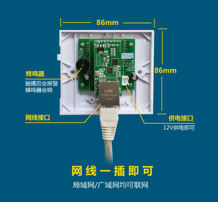 如圖所示:該緊急按鈕只需插上網(wǎng)線并接上12V電源線,然后安裝在86底盒上,最后裝上面板即可設(shè)置IP參數(shù)與宜居通云聯(lián)網(wǎng)報警平臺對接即可完成安裝。