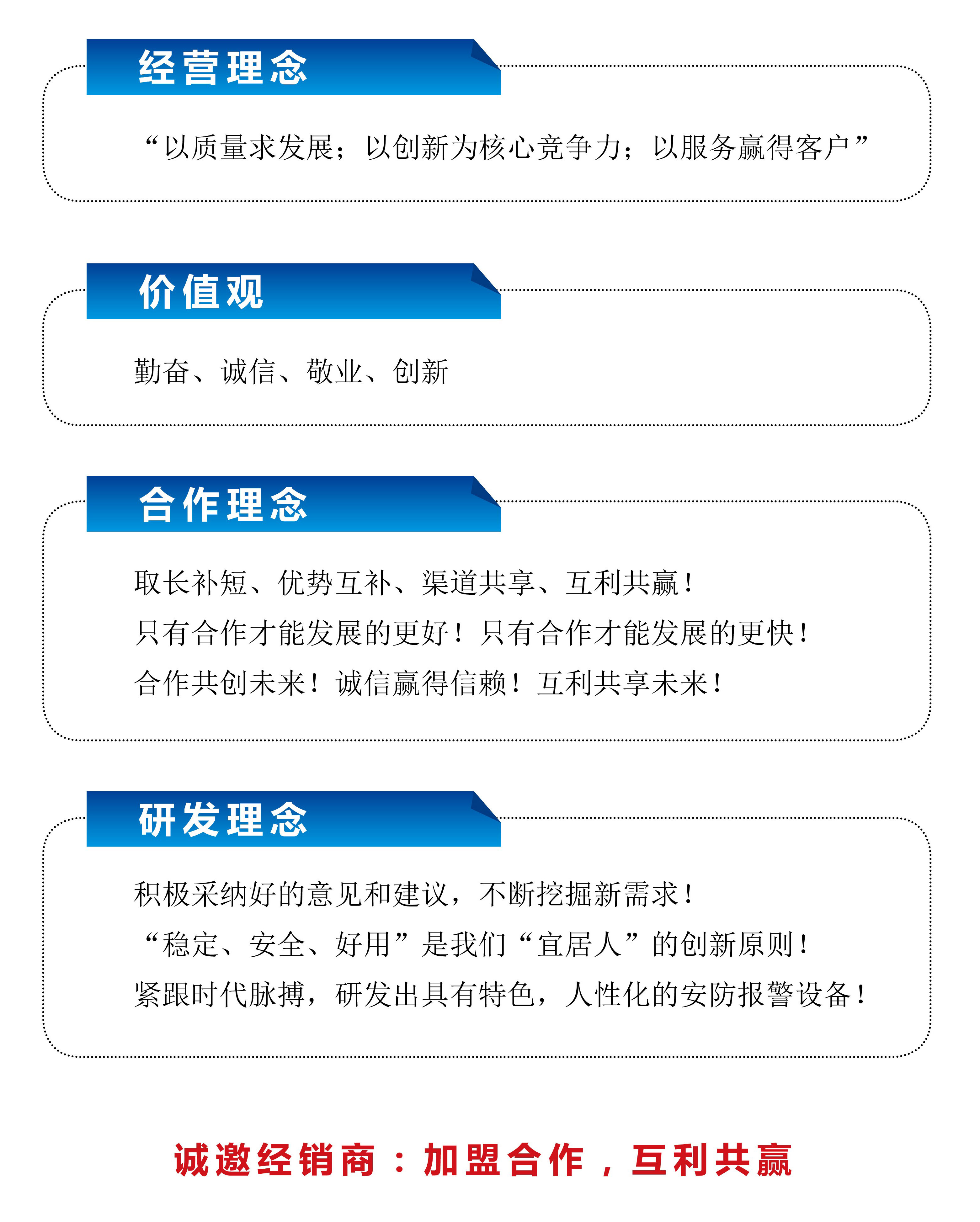 最后、歡迎其他省的安防經(jīng)銷代理商加盟我們宜居通,我們可以為您們提供更好的安防報(bào)警產(chǎn)品和物聯(lián)網(wǎng)報(bào)警綜合解決方案,以及良好的售后服務(wù),為安防報(bào)警市場(chǎng)的開拓共同努力,對(duì)于有著良好的合作關(guān)系的經(jīng)銷代理商,我們可以進(jìn)行更加深度的合作,比如總代理或者地方辦事處等等,也可以為項(xiàng)目型的客戶提供二次開發(fā)和定制服務(wù),提供地方展會(huì)、廣告宣傳支持政策,互利共贏才是合作的長(zhǎng)久之計(jì),歡迎更多的新人加入我們宜居通大家庭。
