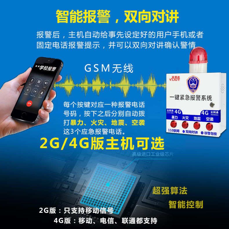 宜居通四鍵4G緊急對(duì)講報(bào)警主機(jī)是集多項(xiàng)先進(jìn)技術(shù)、功能于一體的卓越的智能安全技術(shù)防范產(chǎn)品。緊急報(bào)警系統(tǒng)由報(bào)警主機(jī)、遙控器、報(bào)警喇叭、等組成。觸發(fā)相應(yīng)按鈕,即可觸發(fā)報(bào)警喇叭長(zhǎng)鳴,可通過(guò)遙控關(guān)閉喇叭,安裝方便、操作簡(jiǎn)捷廣泛應(yīng)用于各種金融營(yíng)業(yè)場(chǎng)所、各種倉(cāng)庫(kù)、商業(yè)店鋪、寫字樓辦公室、企事業(yè)單位、家庭等安防系統(tǒng)中。可定制多種功能,如GSM功能,無(wú)線聯(lián)網(wǎng)功能等,主機(jī)面板自帶4個(gè)一鍵緊急報(bào)警按鈕,每個(gè)緊急求助報(bào)警按鈕的警情可自定義修改,比如可改成為:暴力,火災(zāi),地震,空襲等功能。