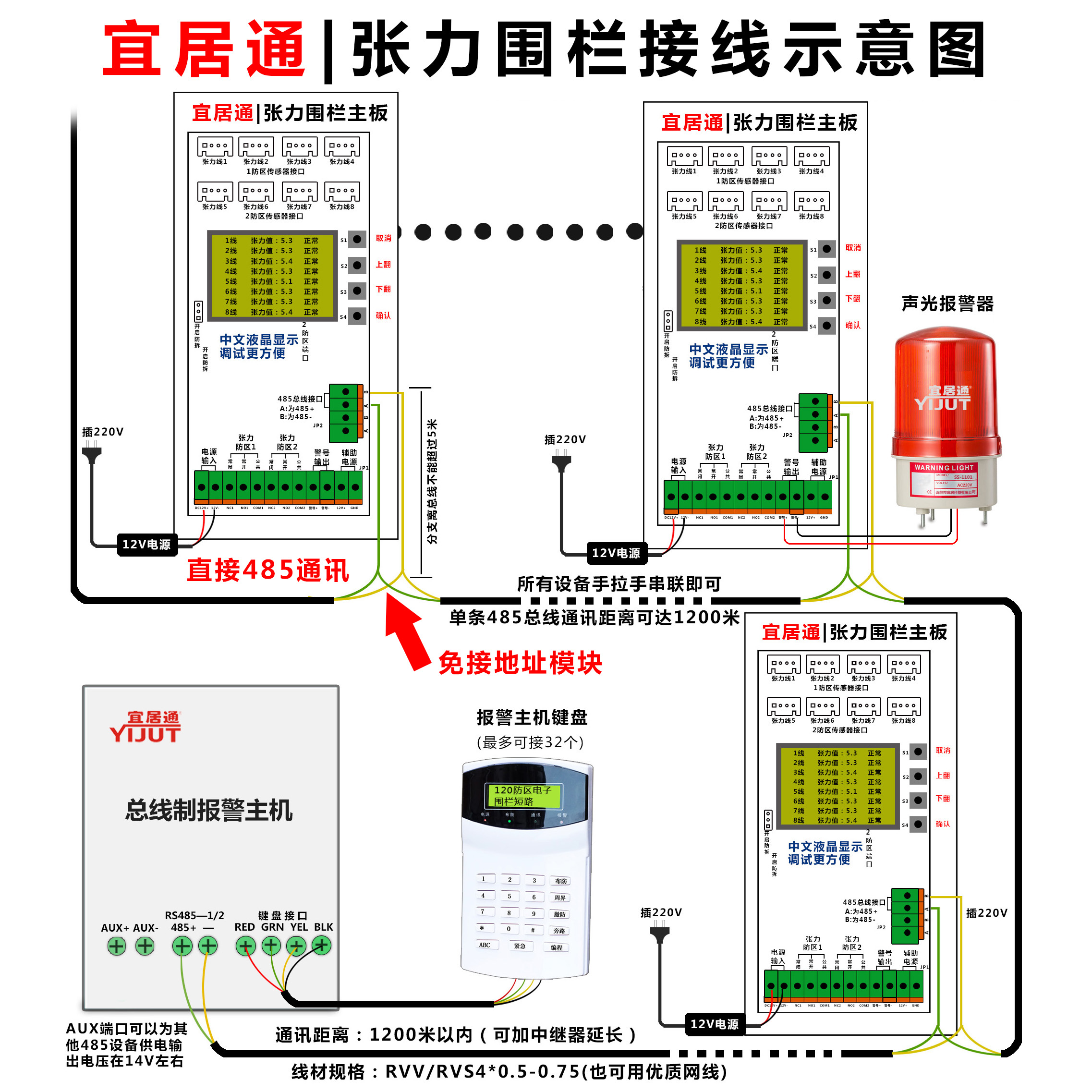 l 如果張力電子圍欄控制器的總控主機配置的是宜居通總線主機則可直接在總線主機上面進行外接擴展宜居通張力電子圍欄控制器即可,不需要配置防區(qū)地址模塊,總控主機可直接反向對任意一臺張力電子圍欄控制器進行布防/撤防控制