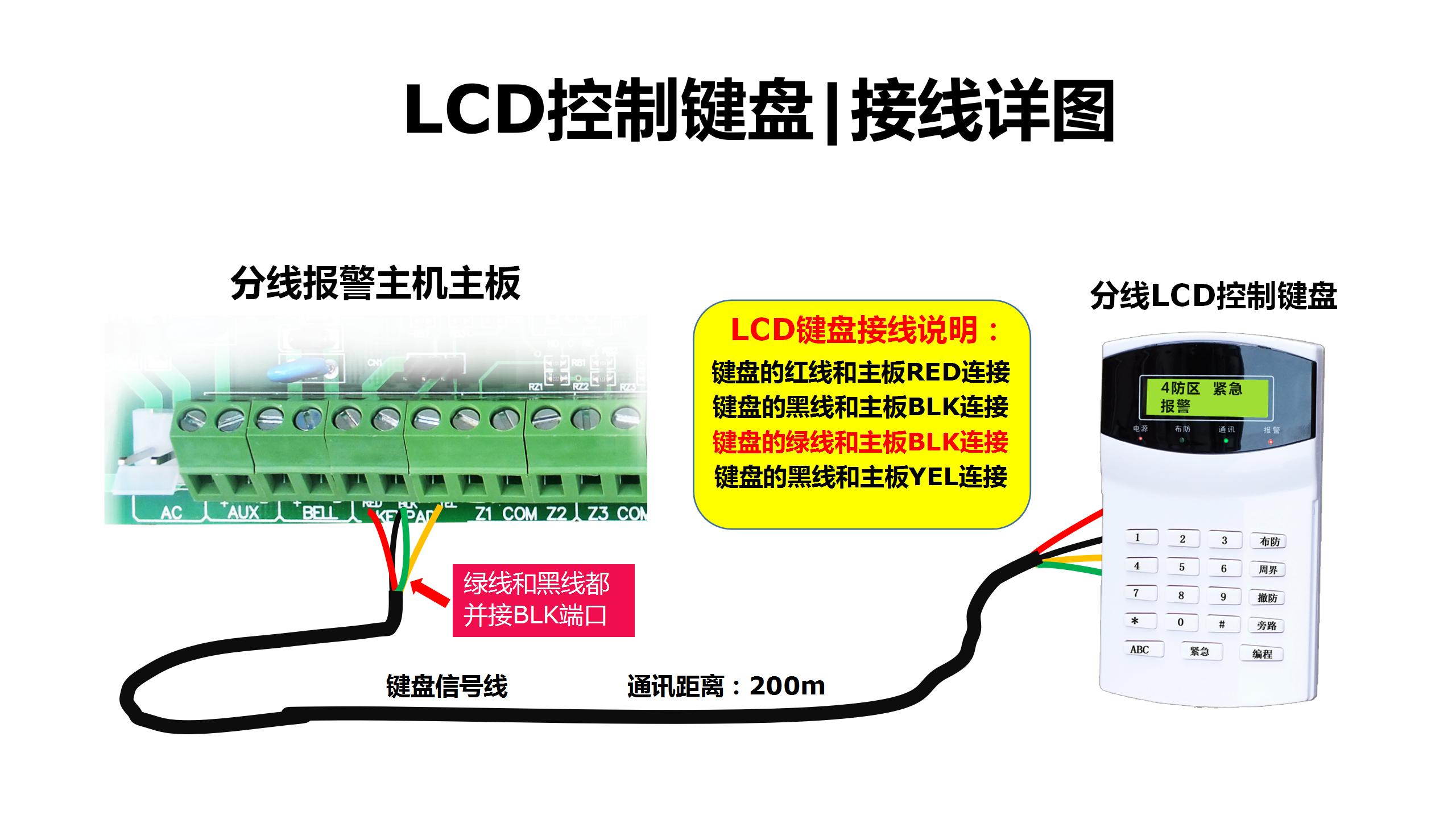 ● 接線說明:如果與分線報警主機共用電源,將分線報警主機的鍵盤接口KEYPAD對應(yīng)的RED、YEL、BLK與主機上鍵盤接口的 “紅(R)、黃(Y)、黑(B)”端子分別相互連接即可,最后再將鍵盤的綠線和主機鍵盤接口的BLK連接。