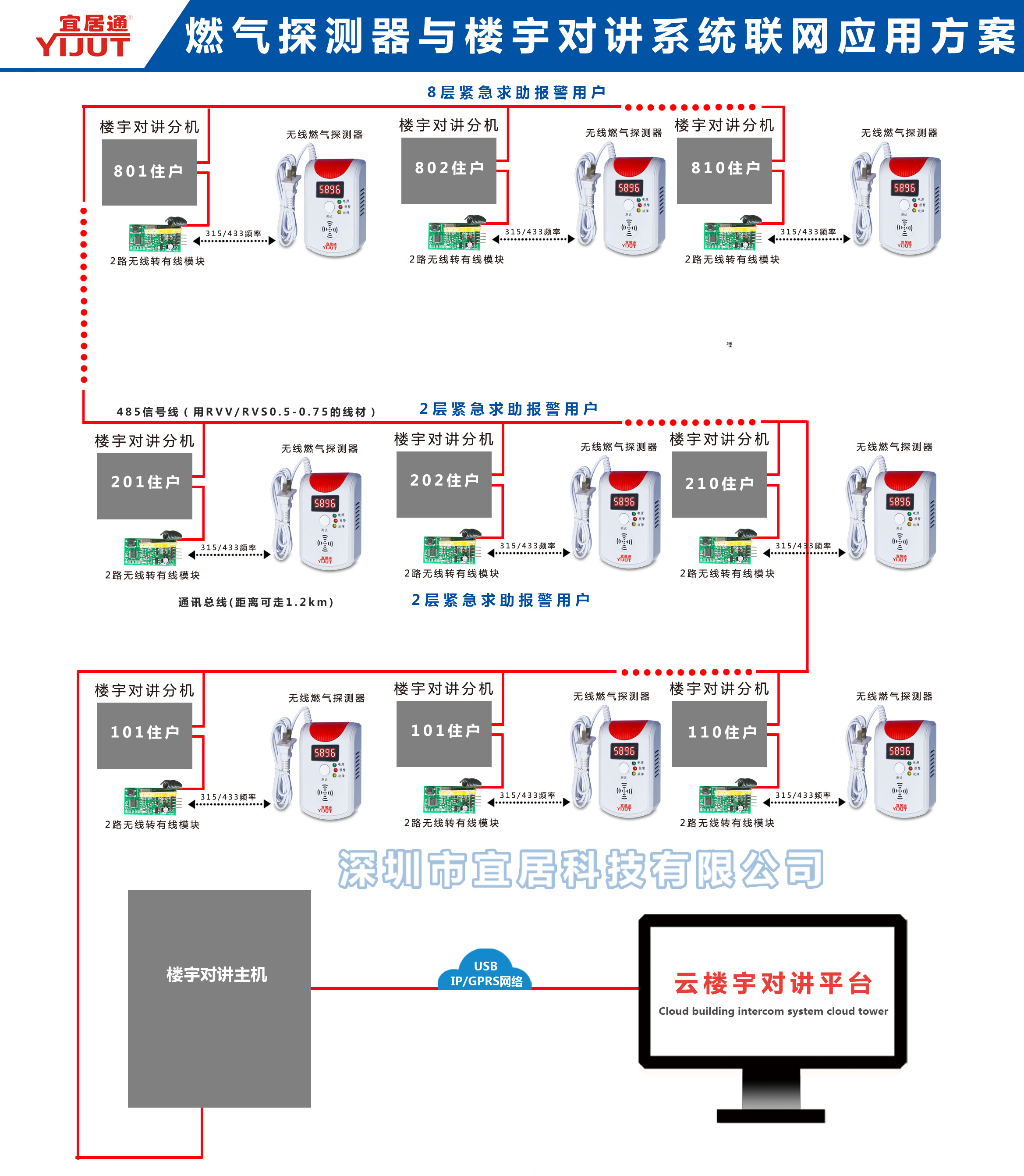 以下是無(wú)線燃?xì)馓綔y(cè)報(bào)警器與智能樓宇對(duì)講系統(tǒng)聯(lián)網(wǎng)應(yīng)用方案圖