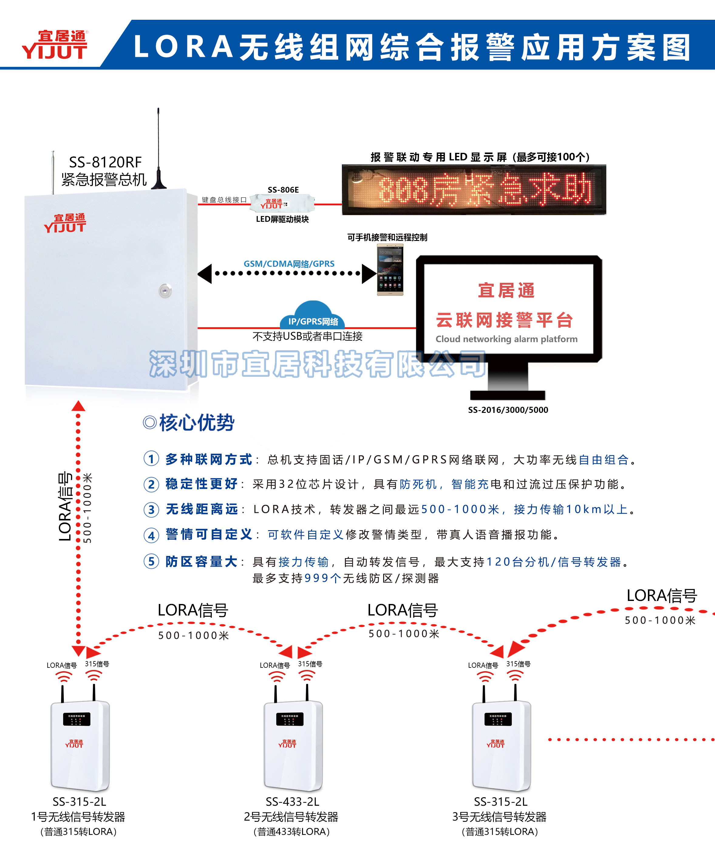 深圳市宜居科技有限公司是國內(nèi)最早從事LORA無線聯(lián)網(wǎng)報(bào)警系統(tǒng)研發(fā)和生產(chǎn)的廠家之一,專注于各種LORA無線聯(lián)網(wǎng)報(bào)警系統(tǒng)的研發(fā)生產(chǎn),公司2008年成立至今,已經(jīng)成功研發(fā)出多種LORA無線聯(lián)網(wǎng)報(bào)警系統(tǒng),通過LORA轉(zhuǎn)發(fā)器,可實(shí)現(xiàn)普通有線開關(guān)量探測器升級為LORA無線信號,并支持多個LORA轉(zhuǎn)發(fā)器自由組網(wǎng)聯(lián)網(wǎng)功能,比如可以將市面上普通的無線緊急按鈕,無線紅外對射,無線紅外光柵、無線燃?xì)馓綔y器、無線煙霧探測器等設(shè)備進(jìn)行跨區(qū)域大規(guī)模無線組網(wǎng)聯(lián)網(wǎng)使用。我們根據(jù)用戶的項(xiàng)目需求來設(shè)計(jì)不同類型的LORA無線聯(lián)網(wǎng)報(bào)警應(yīng)用方案,比如有LORA無線紅外入侵報(bào)警系統(tǒng),LORA無線緊急求助報(bào)警系統(tǒng),LORA無線周界報(bào)警系統(tǒng)、小區(qū)LORA無線燃?xì)庑孤﹫?bào)警系統(tǒng)、以及用于工廠的LORA無線煙霧探測報(bào)警系統(tǒng)等,以滿足不同應(yīng)用需求的無線聯(lián)網(wǎng)綜合報(bào)警系統(tǒng)。用戶可通過各種LORA無線報(bào)警系統(tǒng)應(yīng)用方案圖,快速了解宜居通LORA無線聯(lián)網(wǎng)報(bào)警系統(tǒng)在各種場合中的應(yīng)用,讓安防報(bào)警系統(tǒng)變得簡單易懂。