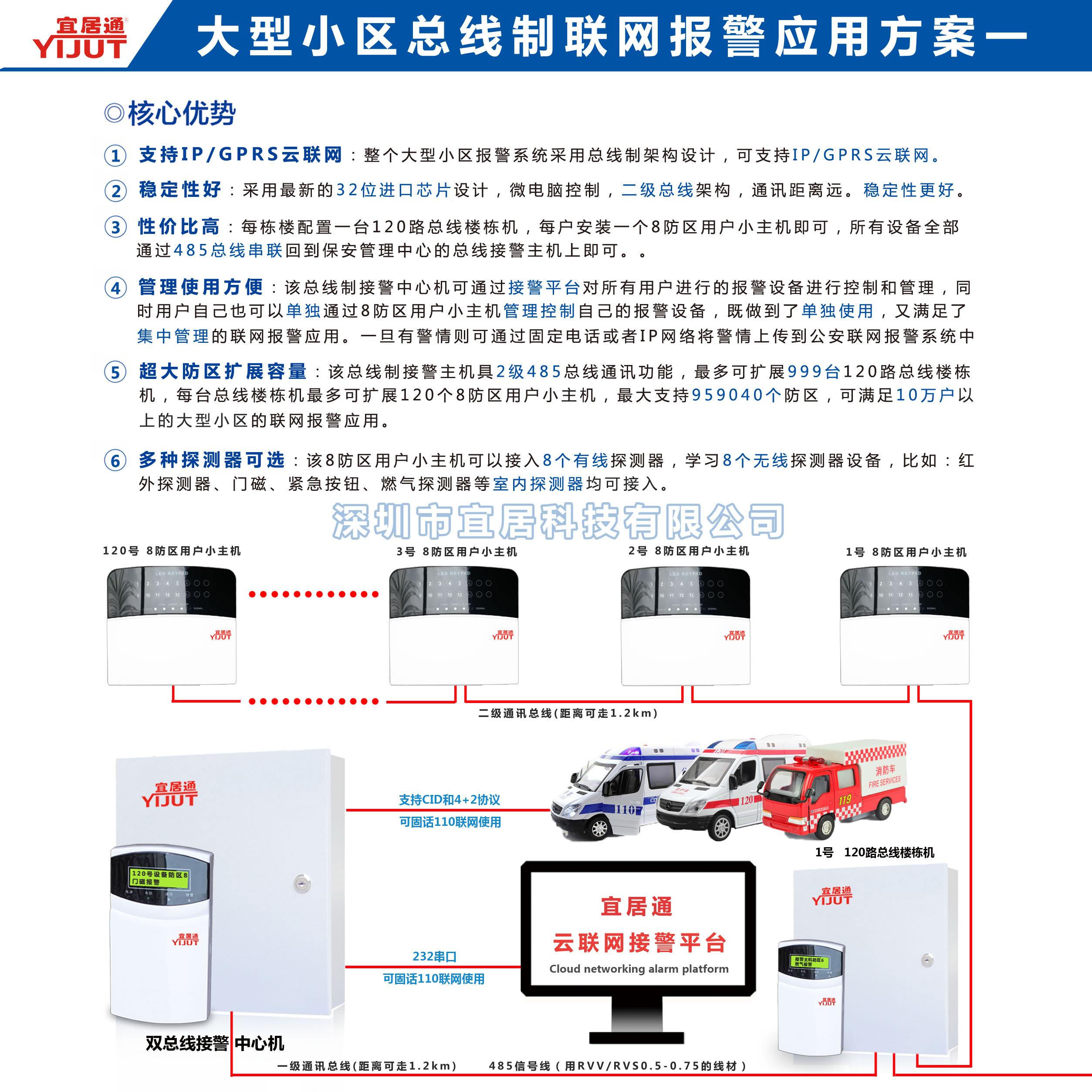 深圳市宜居科技有限公司是一家專業(yè)從事智能聯(lián)網(wǎng)報警主機系統(tǒng)設備研發(fā)、生產(chǎn)、銷售和服務于一體的高科技安防報警公司,公司所生產(chǎn)的產(chǎn)品有大型總線制聯(lián)網(wǎng)報警主機系統(tǒng)、高壓脈沖電子圍欄主機系統(tǒng)、110聯(lián)網(wǎng)報警系統(tǒng)、IP網(wǎng)絡聯(lián)網(wǎng)報警主機系統(tǒng)、GPRS物聯(lián)網(wǎng)報警系統(tǒng)、分線制鐵盒報警主機系統(tǒng)、CDMA電信聯(lián)網(wǎng)報警系統(tǒng)、周界紅外報警系統(tǒng)、燃氣報警系統(tǒng)、緊急求助報警系統(tǒng)等,其中雙總線大型聯(lián)網(wǎng)報警主機系統(tǒng)是“宜居通”安防報警產(chǎn)品中其中一個系列,該系列的產(chǎn)品主要用于大型小區(qū)智能聯(lián)網(wǎng)報警用,它可以很好的把緊急求助報警、燃氣泄露報警、紅外感應報警、圍墻周界報警等多種報警子系統(tǒng)集成到一臺總線制報警主機上面實現(xiàn)集中控制和管理,可以很好的滿足當前和今后的物聯(lián)網(wǎng)報警應用需求。
