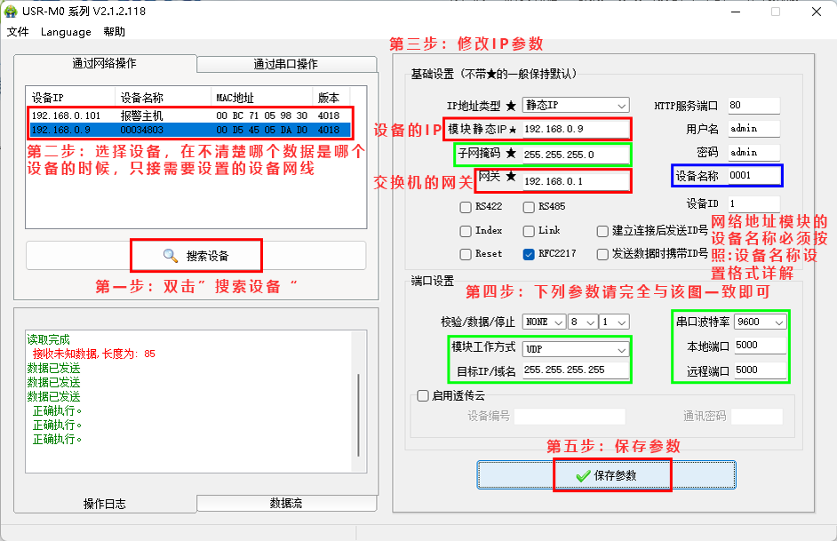 打開“USR-M0_V2.1.2.118”搜索軟件,操作步驟如下所示: