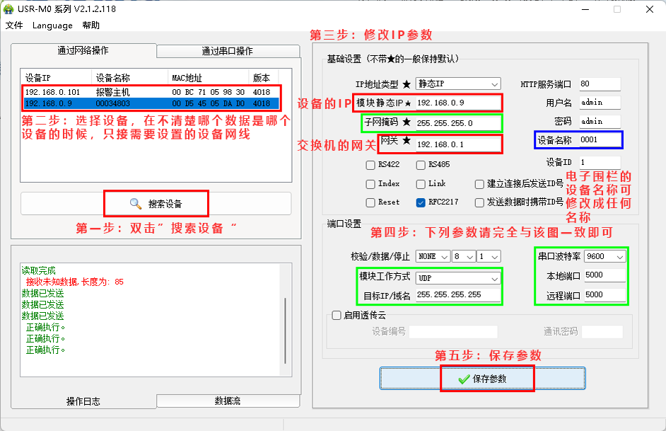 打開(kāi)“USR-M0_V2.1.2.118”搜索軟件,操作步驟如下所示: