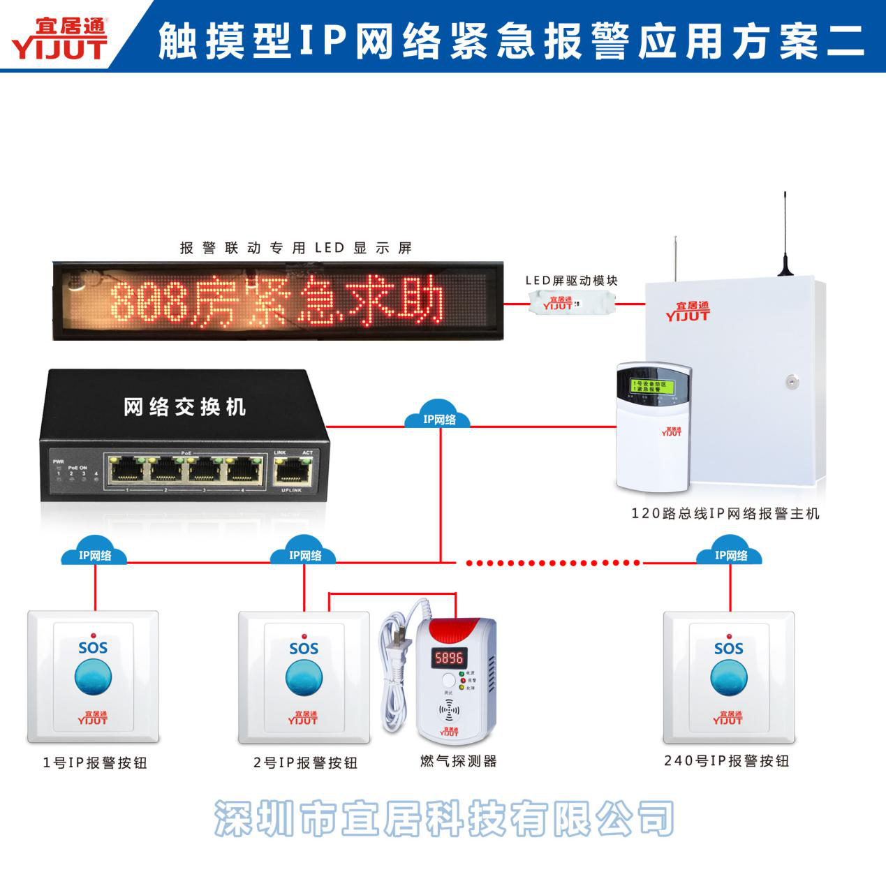 如圖所示:通過安裝一臺宜居通120路總線ip網(wǎng)絡(luò)報警主機,該IP網(wǎng)絡(luò)報警主機具有32個無線防區(qū),可擴展960個總線制防區(qū),可用于各大型小區(qū)、酒店、工廠等安防領(lǐng)域,支持IP聯(lián)網(wǎng)應(yīng)用。因此通過ip網(wǎng)絡(luò)交換機來實現(xiàn)每個房間的ip網(wǎng)絡(luò)緊急按鈕的網(wǎng)絡(luò)連接,同時還可以聯(lián)動輸出燃?xì)馓綔y器,在酒店保安值班室和每層走廊的位置我們也要安裝一個帶報警聯(lián)動專用LED顯示屏,當(dāng)警情發(fā)生時能夠準(zhǔn)確的知道報警位置,從而迅速的做出救助措施。