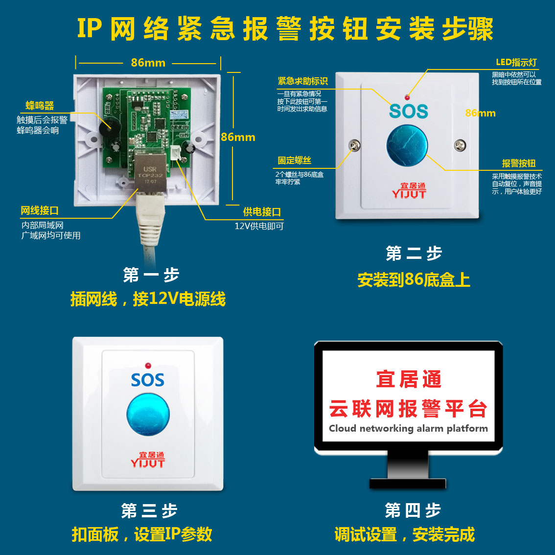 如圖所示:該緊急按鈕只需插上網(wǎng)線并接上12V電源線,然后安裝在86底盒上,最后裝上面板即可設(shè)置IP參數(shù)與宜居通云聯(lián)網(wǎng)報警平臺對接即可完成安裝。