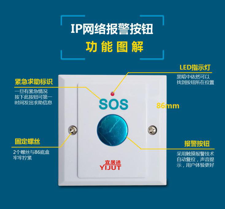 該按鈕采用全新私模設(shè)計,行業(yè)首創(chuàng)。外觀新穎、醒目,觸摸報警自動復(fù)位,安裝方便可以直接和宜居通任意一款總線制IP網(wǎng)絡(luò)報警主機IP聯(lián)網(wǎng)使用,自帶報警輸出,報警可驅(qū)動聲光警號和語音提示,可1秒上傳宜居通IP云聯(lián)網(wǎng)報警平臺。