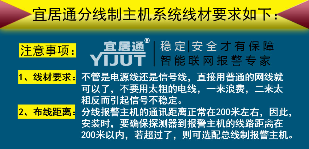 由于分線報警主機上的防區(qū)是開關(guān)量信號,因此距離只能控制在200米左右,不能太遠,太遠信號太弱到賬主機識別不到,不像總線主機通訊距離可達1.2km以上。如果超過了200米建議您選配總線制報警主機,因為總線報警主機通訊距離更遠,布線更簡單,所有防區(qū)可以一條信號線串聯(lián)即可。